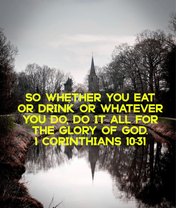 1 Corinthians 10:31 Share this: Click to share on Facebook (Opens in new window) Facebook Click to share on X (Opens in new window) X Like Loading... Related