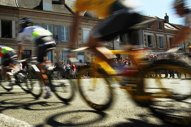 REIMS, FRANCE – JULY 07: The yellow bike of race leader Fabian Cancellara passes with the peloton along the 153.5km course in stage four of the Tour de France on July 7, 2010 in Reims, France. A relatively flat stage, the route featured only one category four climb. Italian Alessandro Petacchi with the Lampre team won the stage in a sprint finish. Swiss rider Fabian Cancellara of team Saxo Bank has kept hold of the yellow jersey while Lance Armstrong sits in 18th place overall. The iconic bicycle race will include a total of 20 stages and will cover 3,642km before concluding in Paris on July 25. (Photo by Spencer Platt/Getty Images)